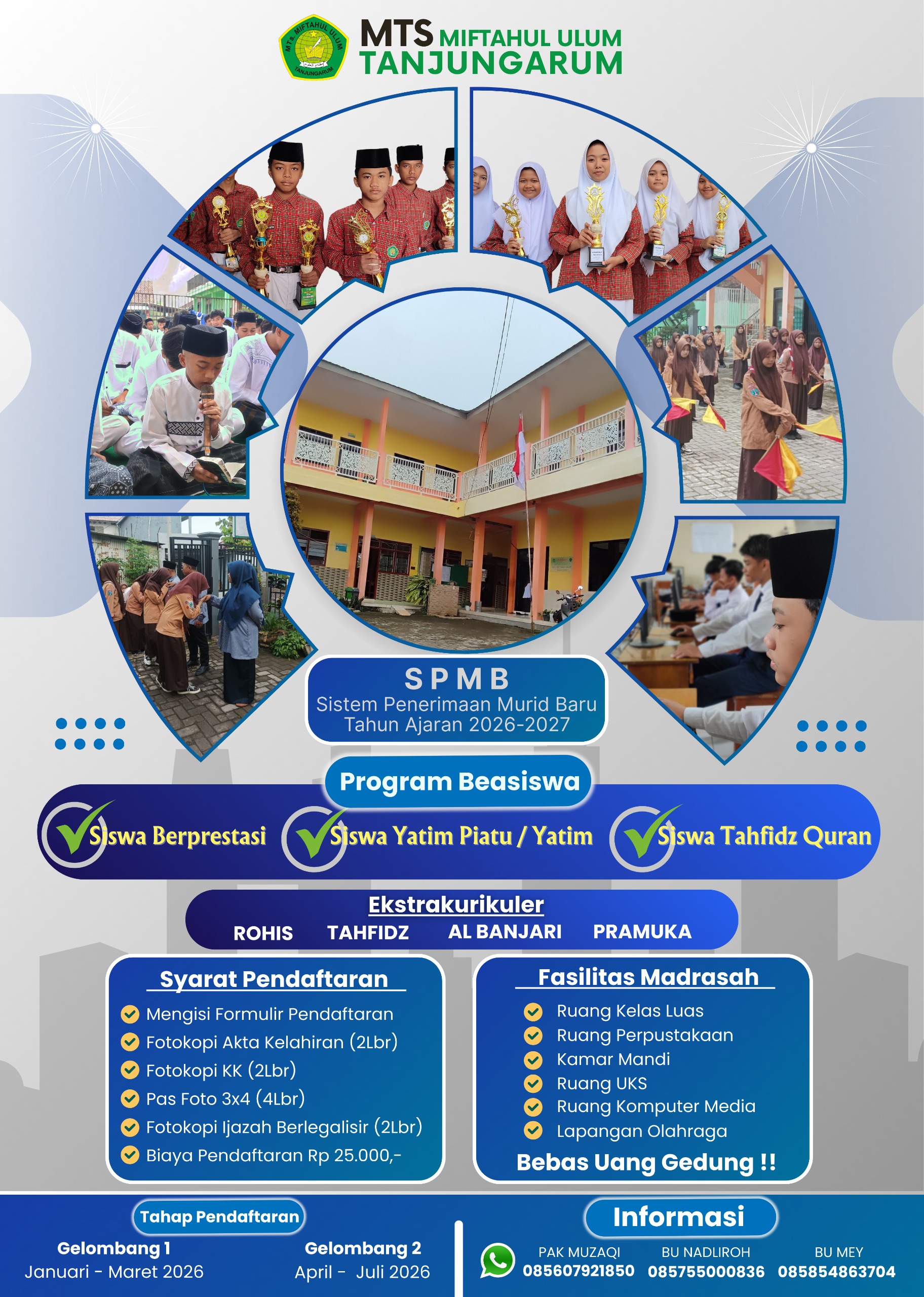 MTs Miftahul Ulum Tanjungarum membuka kesempatan bagi calon peserta didik baru untuk bergabung dalam lingkungan pendidikan berkualitas yang berorientasi pada pengembangan akademik dan karakter. Berikut adalah informasi mengenai proses Penerimaan Peserta Didik Baru (PPDB) Tahun Ajaran 2026/2027.